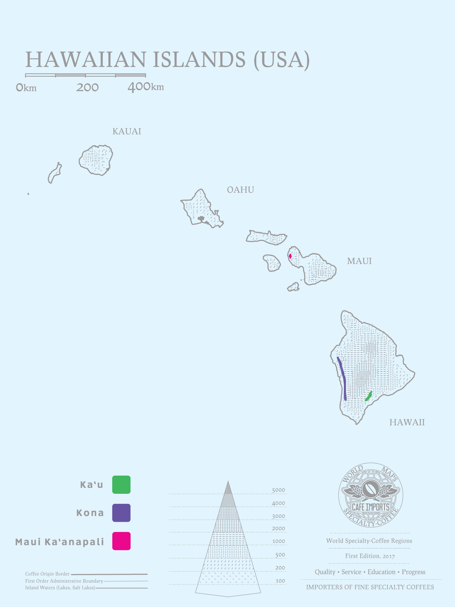 Most lovers of Hawaiian coffees love their balanced, mild and clean profile, that classic Bourbon sweetness. Perhaps the soft nutty flavor recalls mornings spent on a honeymoon in an island breeze. At Cafe Imports, we are also seeking out those small-farm lots that display special character in the cup, as well as interesting rarities like certified organic offers, and offbeat island origins. We continue to seek new relationships with Hawaiian growers, and think that the best is yet to come from our friends in the Aloha State.