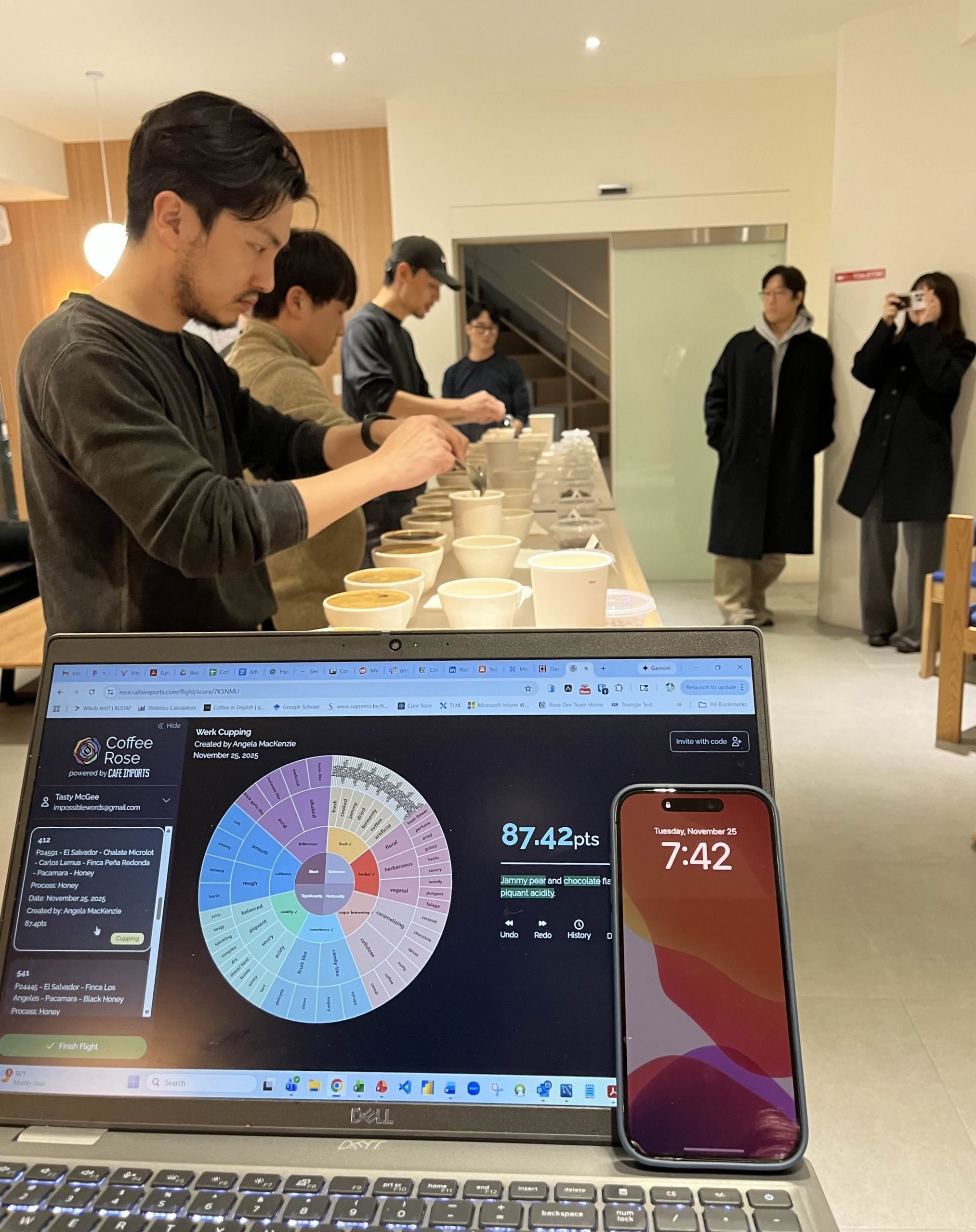 We’ve used the Rose at Cafe Imports since the beginning of 2021, assessing thousands of coffees and training many new employees in that time. Recently, I joined our Asia sales rep Angie MacKenzie for a 3-city tour to present the Rose (and some delicious coffees) to some of our customers in Hong Kong, Busan, and Seoul. Surprising nobody, the turnout and engagement were stupendous. Here’s an overview of what we talked about in these sessions: