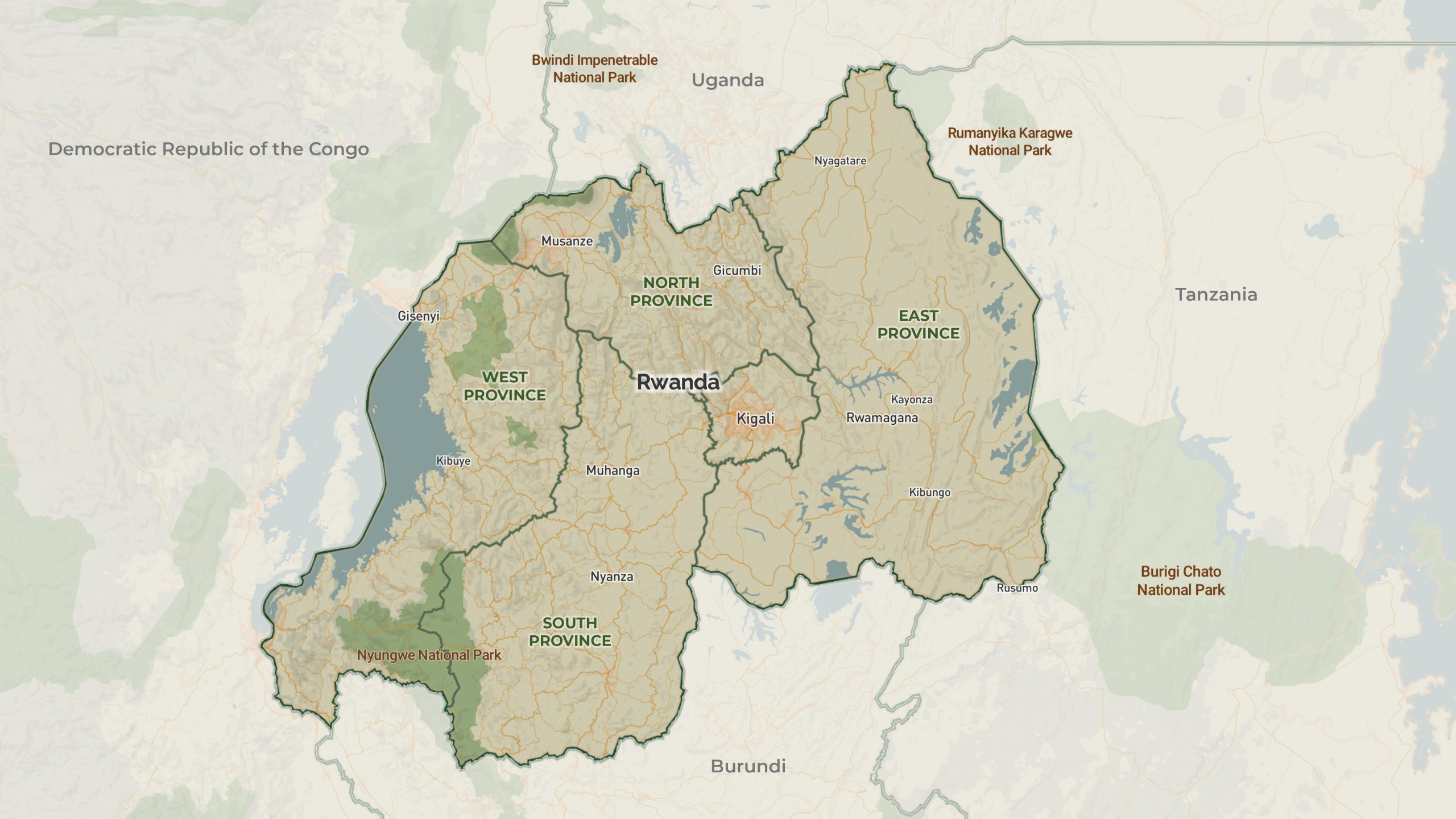 You’ll hear it repeated by farmers as you wind your way across the landscape, pinned above the entrance as a welcome in the airport, and on the billboards around Kigali, but “The land of a thousand hills” is no mere marketing slogan. Africa’s fourth-smallest mainland country is home to countless volcanic and water-hewn peaks and valleys. From the surface of Lake Kivu at 1,460m to the top of Mt. Karisimbi at 4,507m, this ruggedly carved landscape creates a vast array of microclimates and growing conditions across the main coffee-growing regions [6]. These coffee growing regions more-or-less fall within Rwandas provinces, which were drawn following the natural features in the landscape.