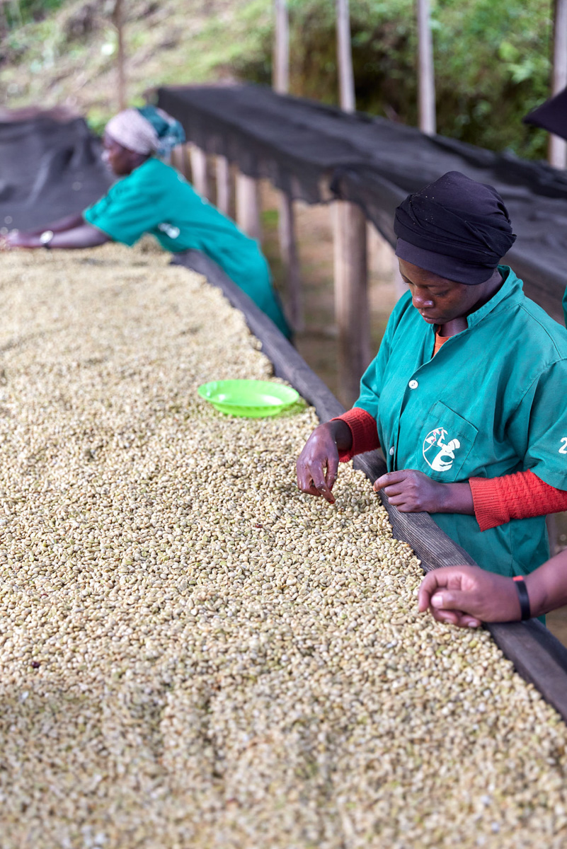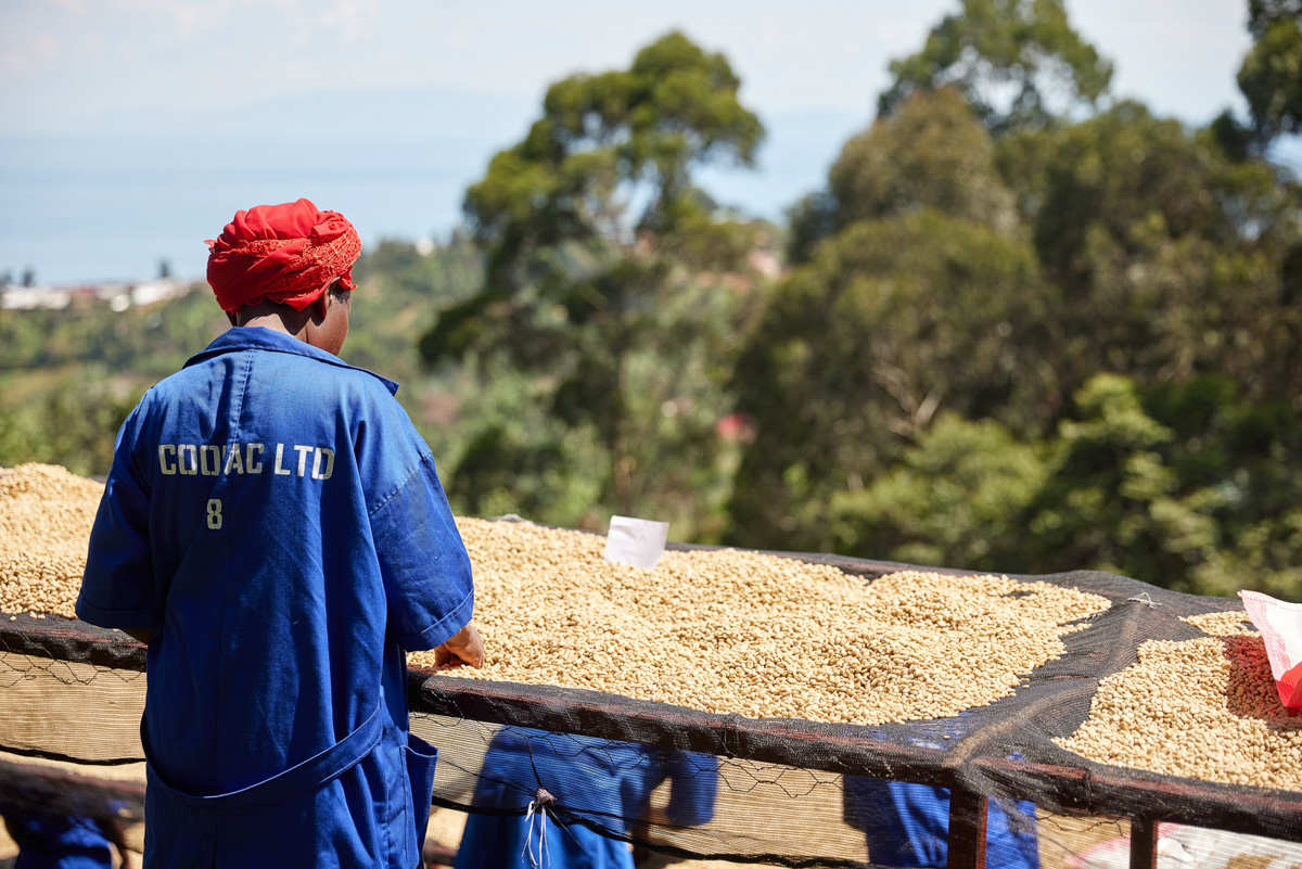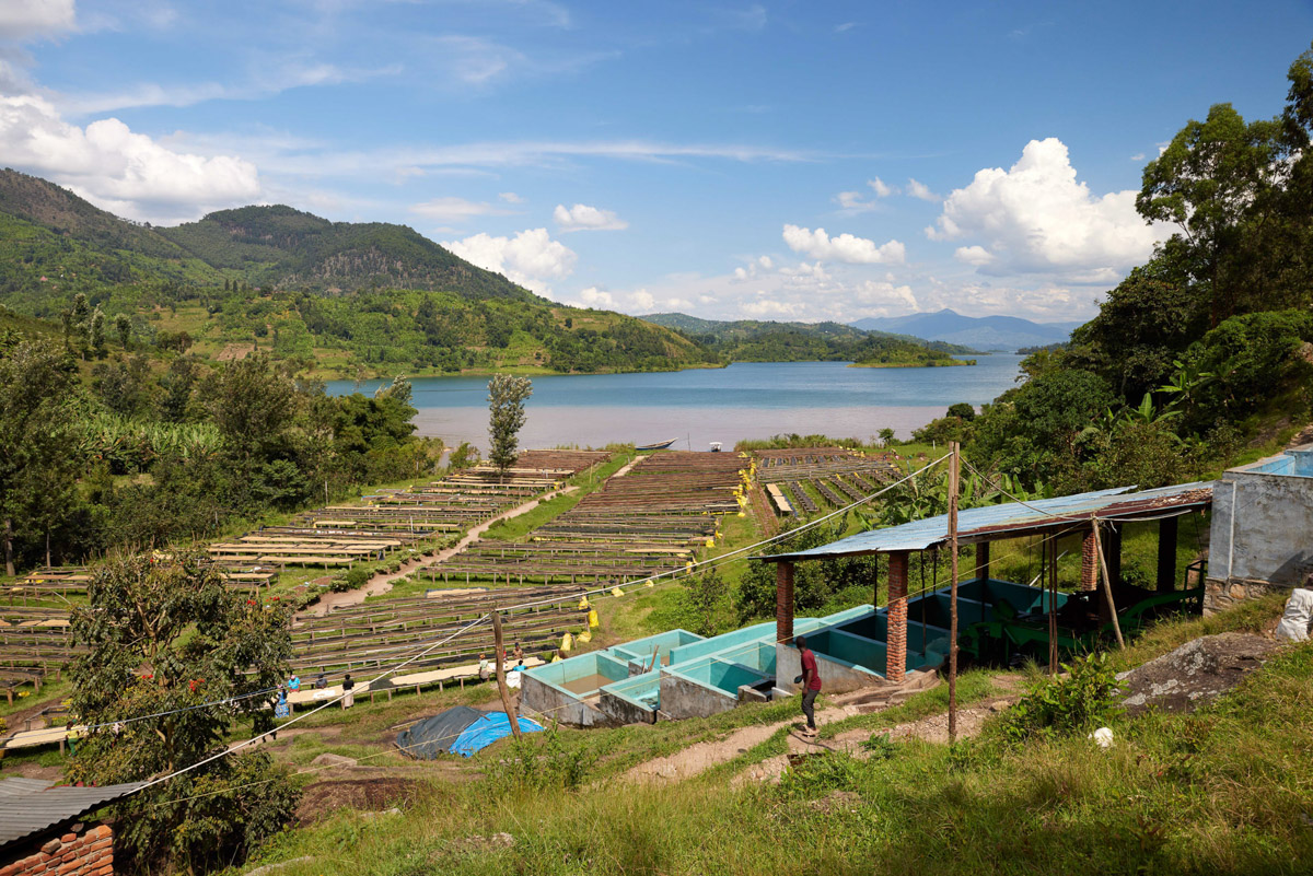 Back in the launch, it’s getting choppy, making progress down the lake slow as steel blue storm clouds gather on the horizon. We spot a group of men waving from shore with an array of raised beds unfolding up the valley behind them. Kirorero is a unique and stunningly beautiful place. Tucked in the steep walls of the Gasuma valley right at the shoreline, Kirorero receives coffee from around 1500 farmers that deliver cherry primarily by boat, foot, or bicycle.
