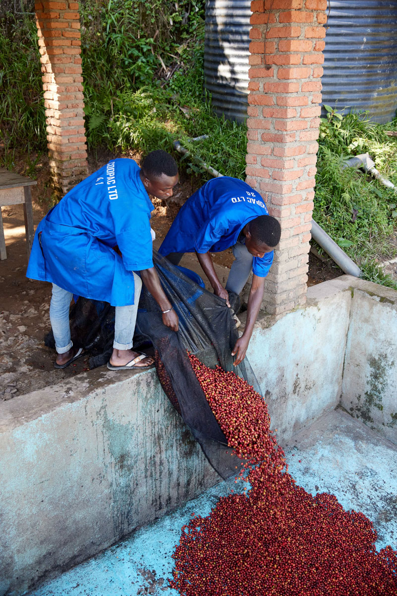 COOPAC has made a substantial investment in washing stations here. Founded by the current organization president Emmanuel Rwakagara in 2001 alongside around 110 other farmers who wanted to work towards higher-quality coffees while minimizing environmental impact and building social programs for their membership, COOPAC is our longest-standing partner in Rwanda. Fast forward to today, and they’ve grown to six washing stations with 8,000 members and counting. Farmer support programs are still core to their mission. Providing agronomic and quality improvement training, fertilizers and farm inputs, and community support through the construction of schools and infrastructure, COOPAC has been key to shaping coffee in Rwanda.