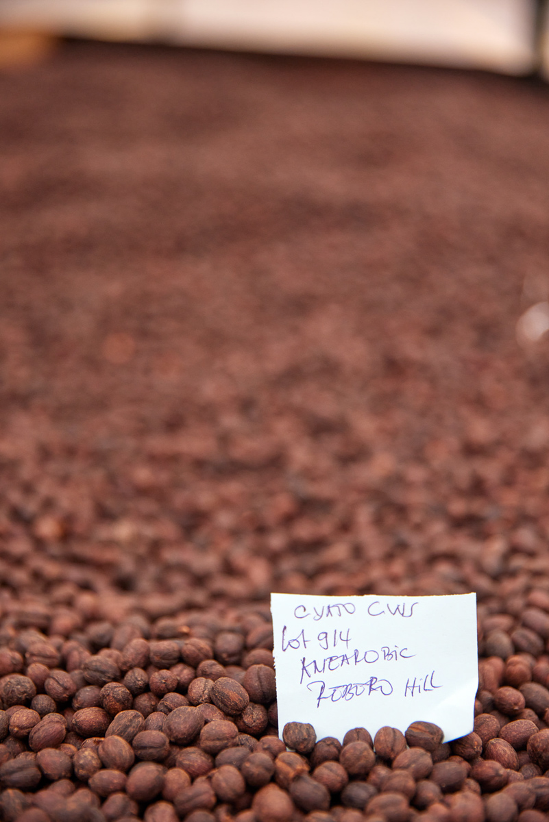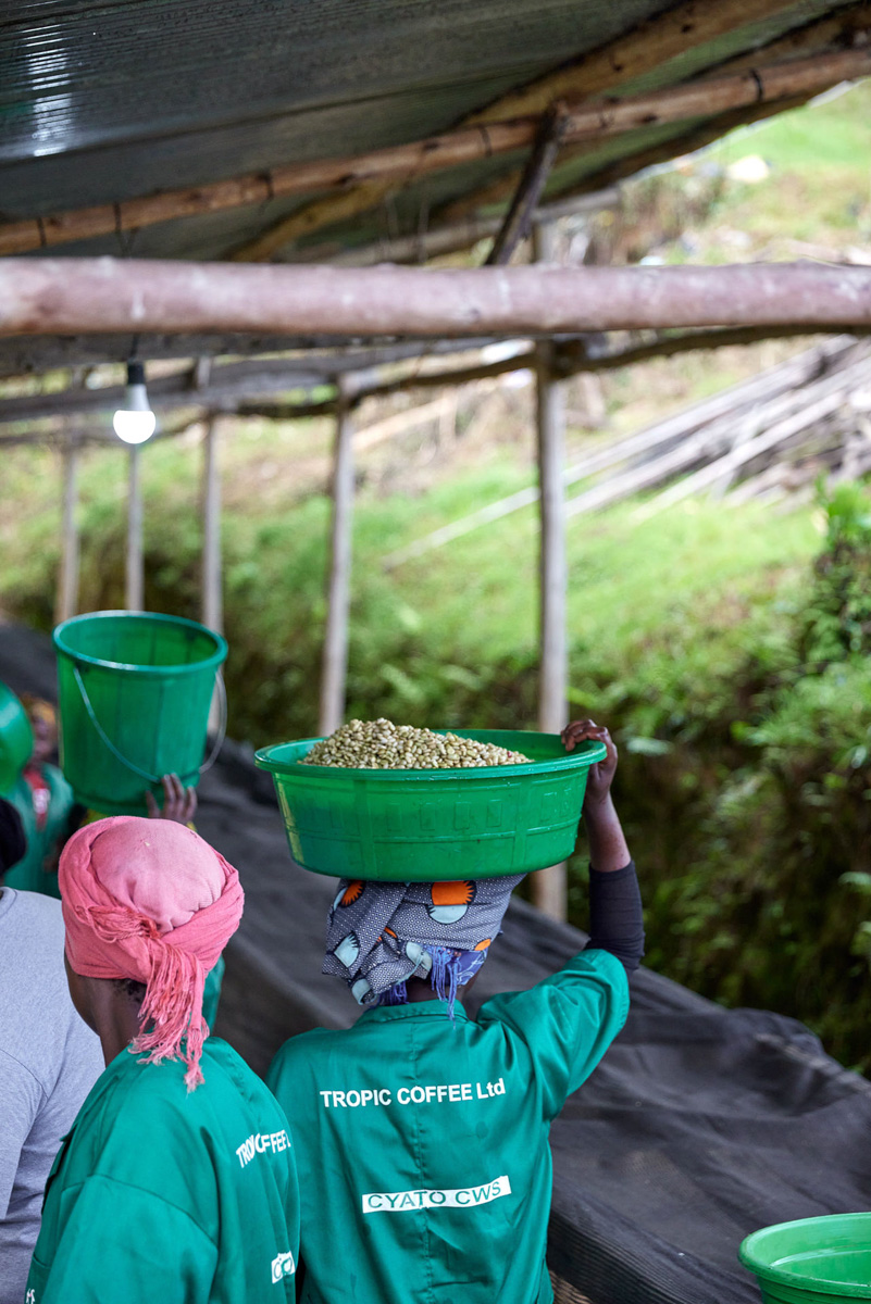 Like most washing stations in Rwanda, they buy coffee in cherry from farmers in the surrounding area, which is hand sorted by color for ripeness, cupped, combined based on quality, or separated out as micro-lots. Cyato is fully equipped to produce washed, honey, natural, and anaerobic coffees, which, after processing, are dried on raised beds, either out in the open or in the greenhouse that was recently built onsite. Each lot, no matter how big or smallundergoes multiple quality control cuppings at the washing station and the Tropic cupping lab in Kigali.